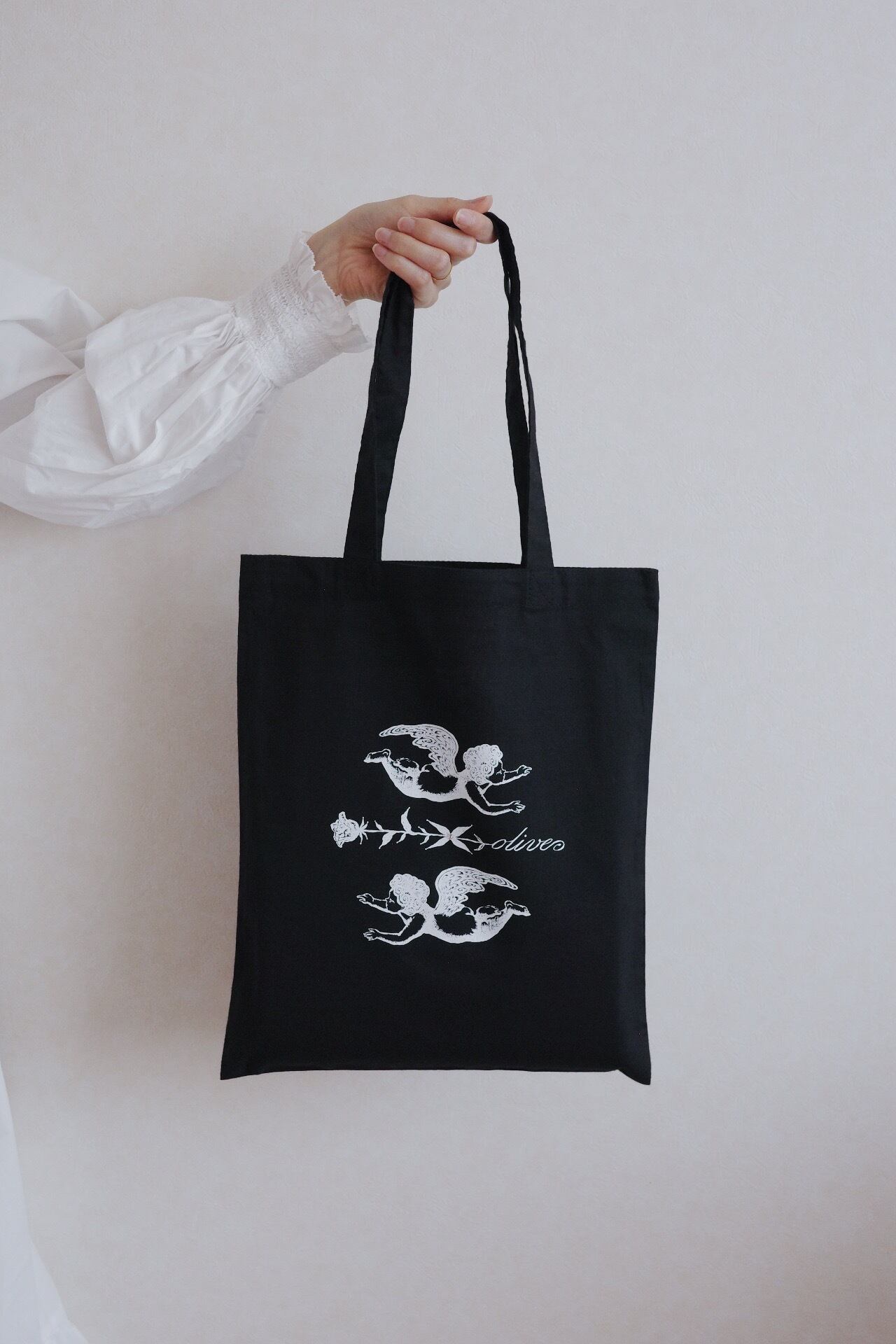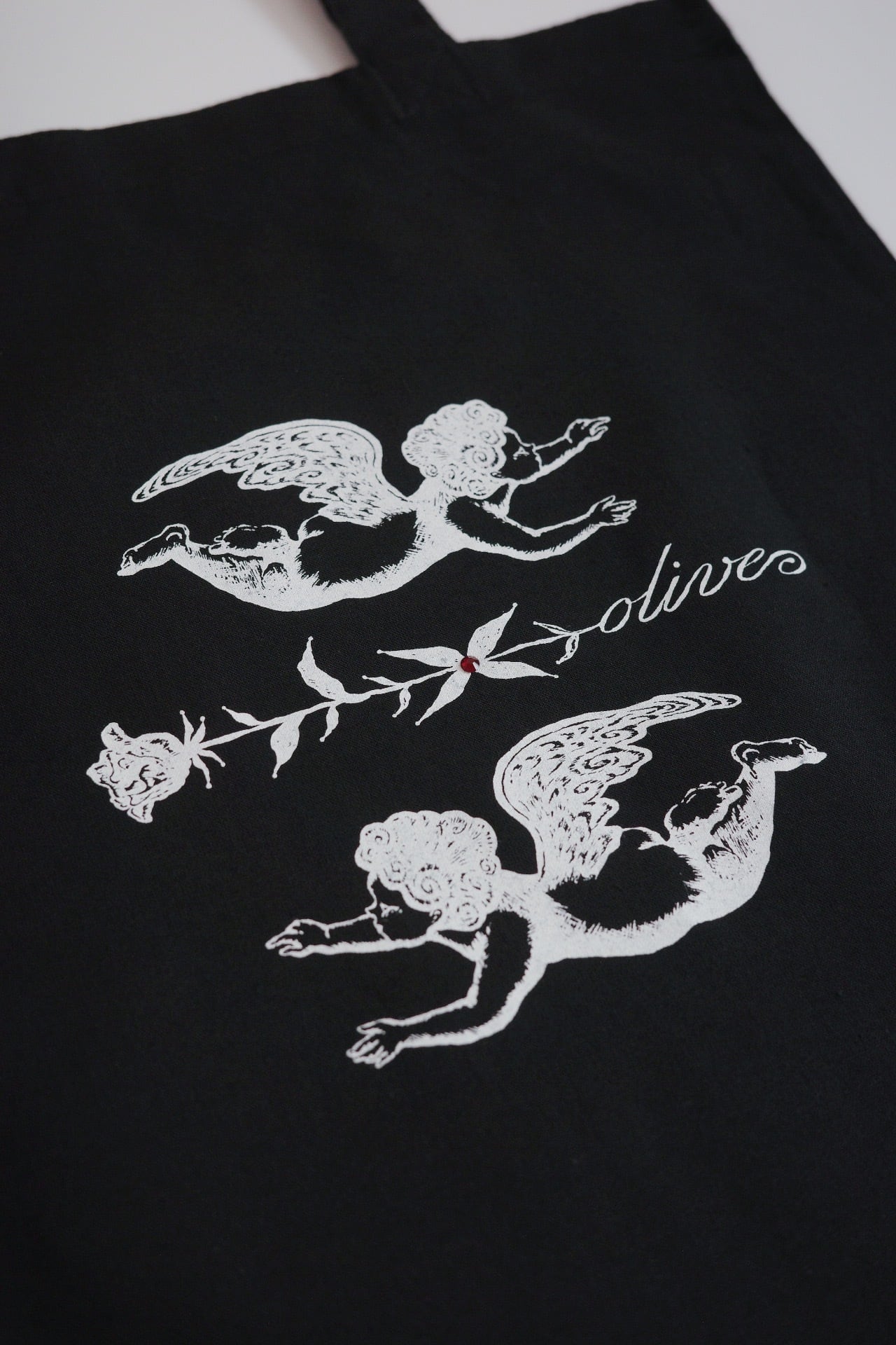 2人の天使のイラストが印刷されたオリジナルトートバッグ。真ん中にはさりげなくラインストーンをひとつひとつ手作業で付けました。ラインストーンの色はクリアとシャム(深みのある赤)の2種類です。